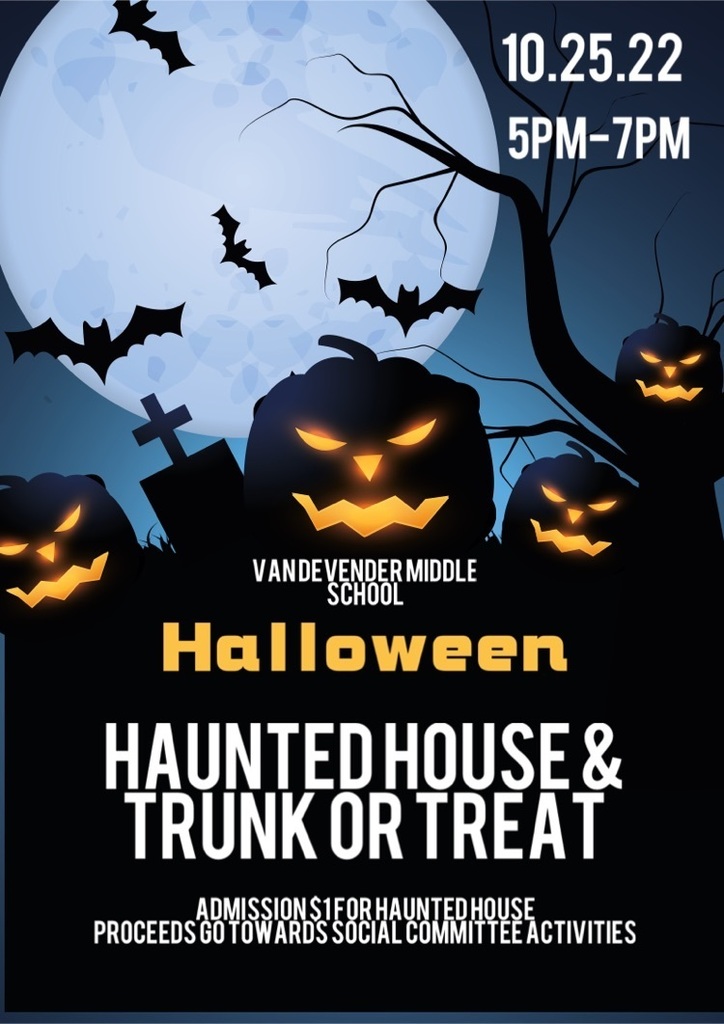 Don’t forget- Vandy Trunk or Treat Tuesday, Oct 25 AND Haunted House (sponsored by Vandy Social Committee) 5-7pm. Trunk or Treat is free-and family sponsored trunks welcome to participate and hand out candy to students. Haunted House $1 per entry with proceeds going to Social Committee for future school activities.